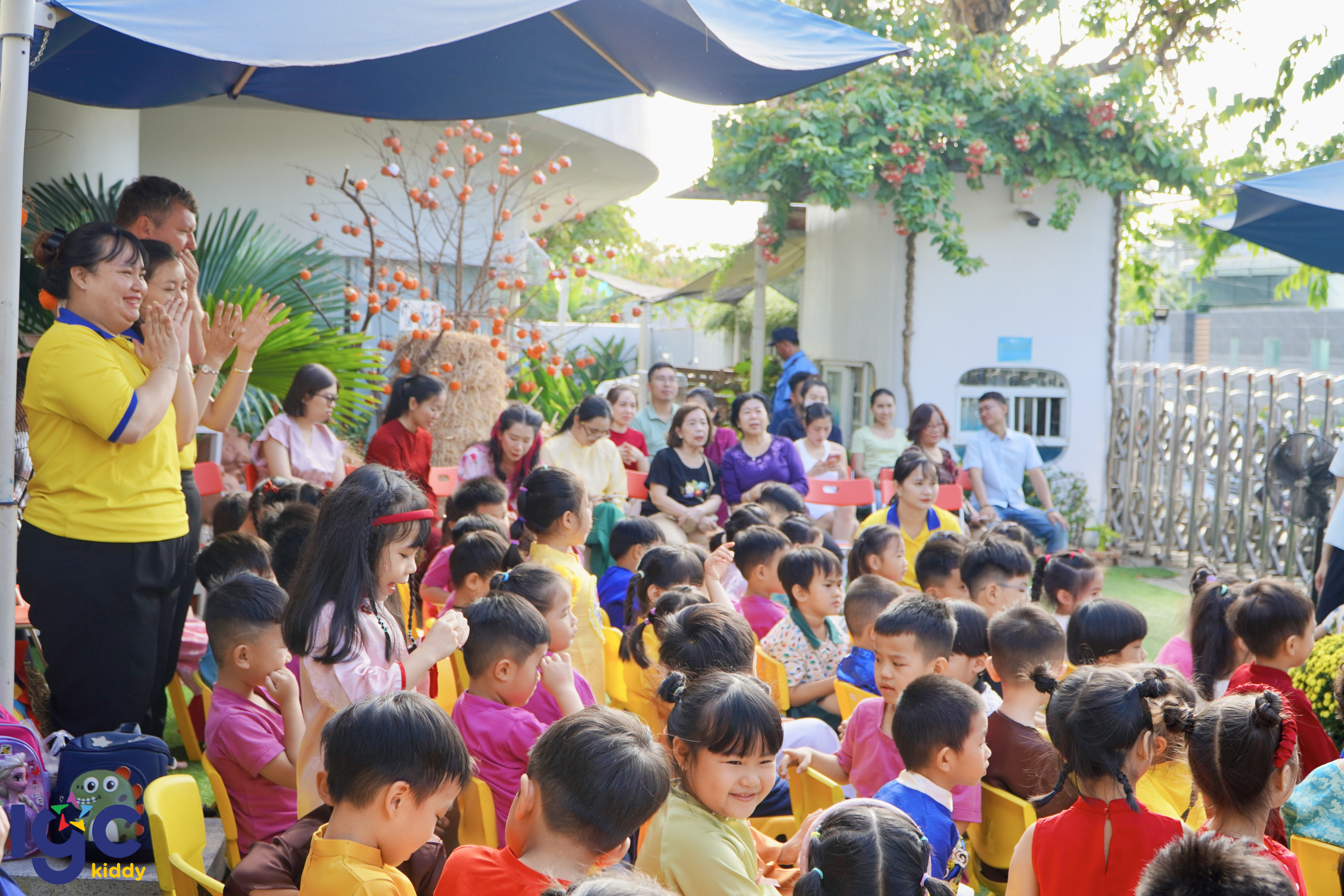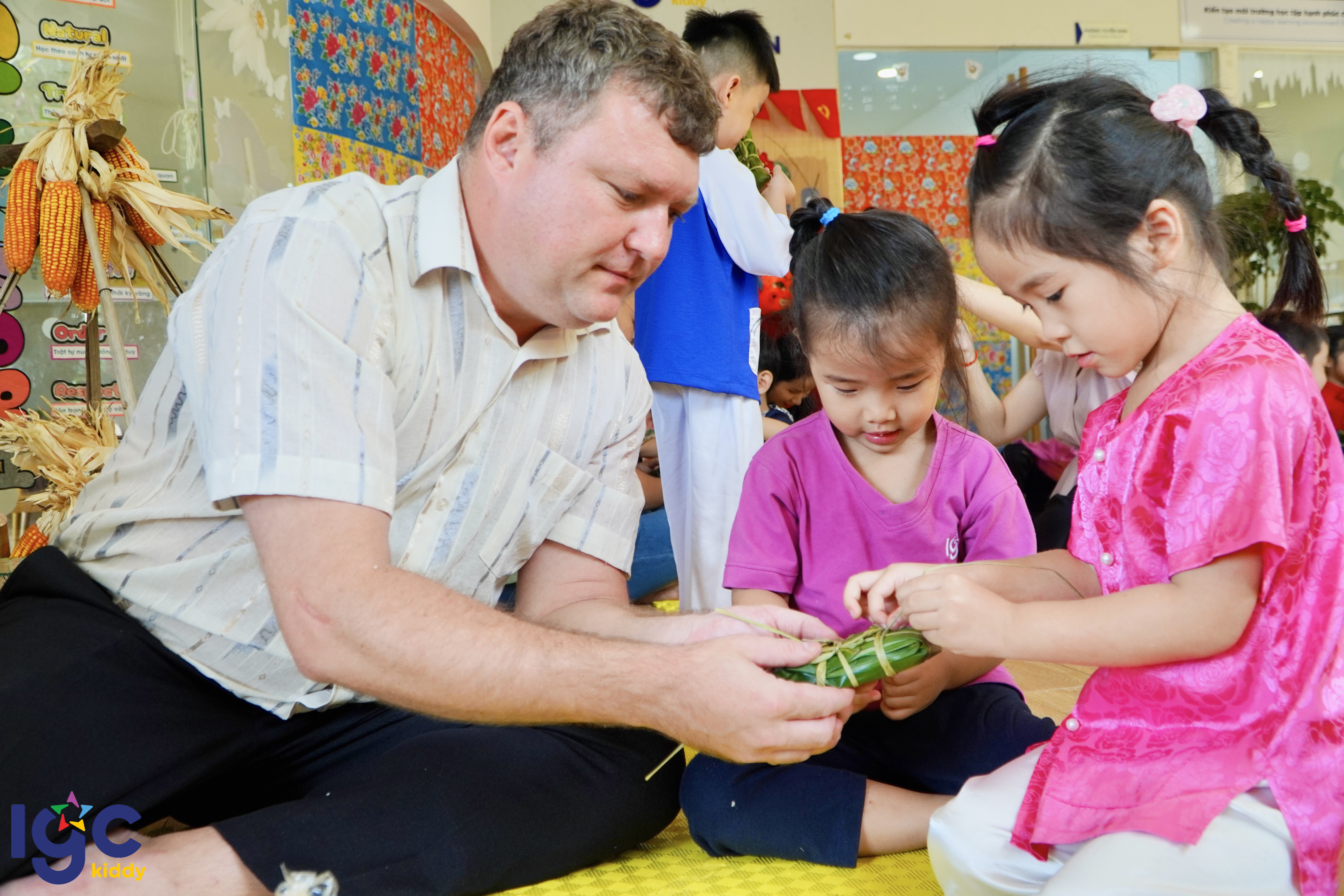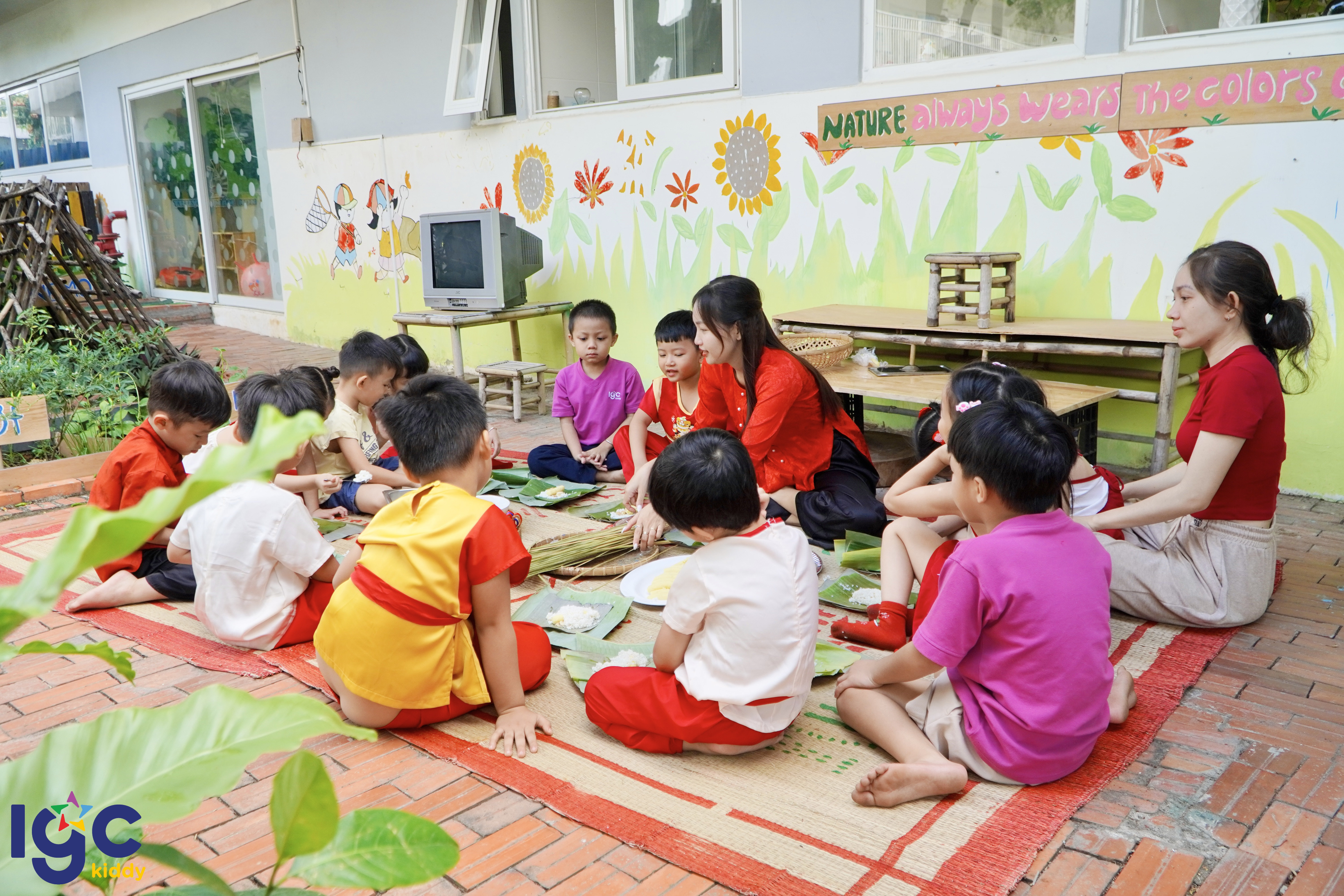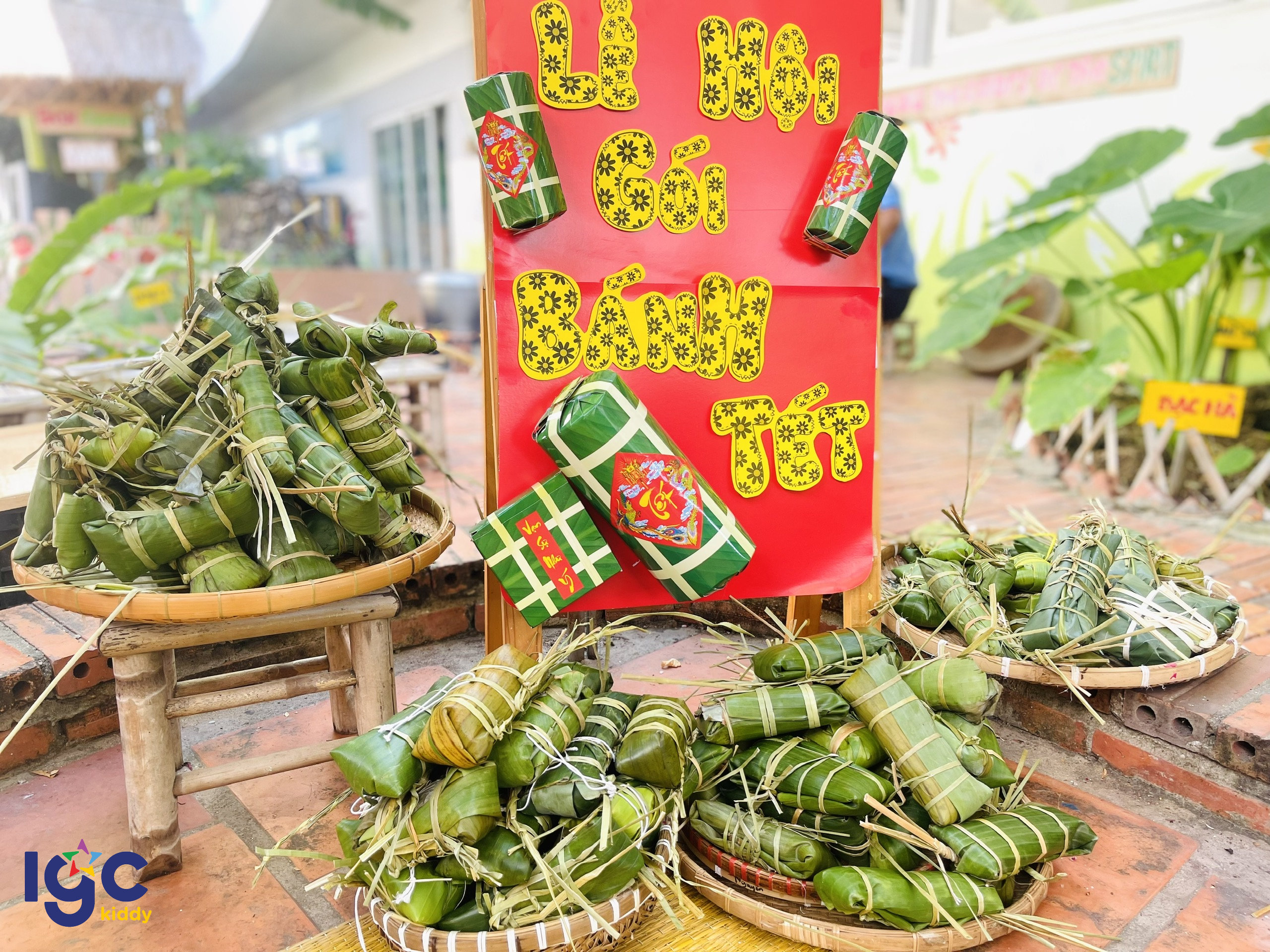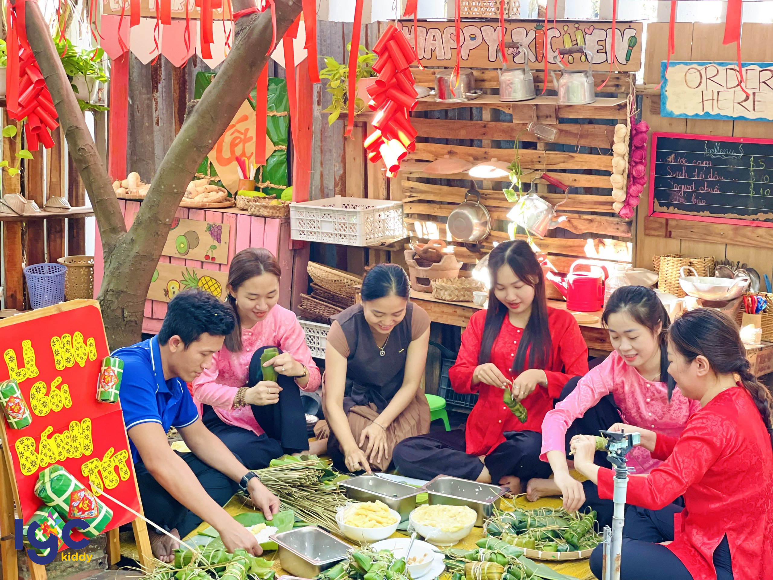 Không gian Tết tại IGC Kiddy Tây Ninh ngập tràn sắc xuân với những hương vị quen thuộc của ngày Tết. Từ lá dong xanh mướt, nếp thơm dẻo đến đậu xanh, thịt mỡ – tất cả tạo nên bức tranh ẩm thực truyền thống sống động ngay trong khuôn viên trường. Các bé được trực tiếp tham gia vào hoạt động gói bánh chưng, quấn đòn bánh tét và tìm hiểu quy trình làm dưa hành ngày Tết. Thông qua hoạt động trải nghiệm gói bánh chưng, bánh tét, trẻ không chỉ được vui chơi mà còn phát triển kỹ năng vận động tinh, khả năng quan sát và tinh thần làm việc nhóm. Dưới sự hướng dẫn tận tình của thầy cô, các con tự tay xếp lá, cho nếp, thêm nhân và gói bánh một cách tỉ mỉ. Mỗi chiếc bánh hoàn thành là một niềm vui lớn, là thành quả của sự cố gắng và hợp tác. Lễ hội gói bánh chưng tại IGC Kiddy Tây Ninh còn mang ý nghĩa giáo dục sâu sắc. Các con hiểu rằng Tết không chỉ là những ngày nghỉ lễ, mà còn là dịp để sum vầy, đoàn viên và sẻ chia yêu thương. Nếu Tết bên gia đình là sự ấm áp, Tết bên bạn bè là niềm vui rộn ràng thì Tết tại IGC Kiddy Tây Ninh chính là nơi nuôi dưỡng cảm xúc, tình bạn và những ký ức tuổi thơ đẹp đẽ. Với định hướng giáo dục gắn liền trải nghiệm thực tế và giá trị truyền thống, IGC Kiddy Tây Ninh luôn chú trọng tổ chức các hoạt động văn hoá ý nghĩa nhằm giúp trẻ phát triển toàn diện cả về kỹ năng sống, cảm xúc và nhận thức. Lễ hội gói bánh chưng, bánh tét không chỉ tái hiện nét đẹp Tết Việt mà còn gieo vào lòng trẻ niềm tự hào về bản sắc dân tộc. Ba mẹ hãy cùng IGC Kiddy Tây Ninh đồng hành cùng con trong những hoạt động trải nghiệm mùa xuân, để mỗi mùa Tết trôi qua đều trở thành một dấu mốc đáng nhớ trong hành trình lớn khôn của trẻ.