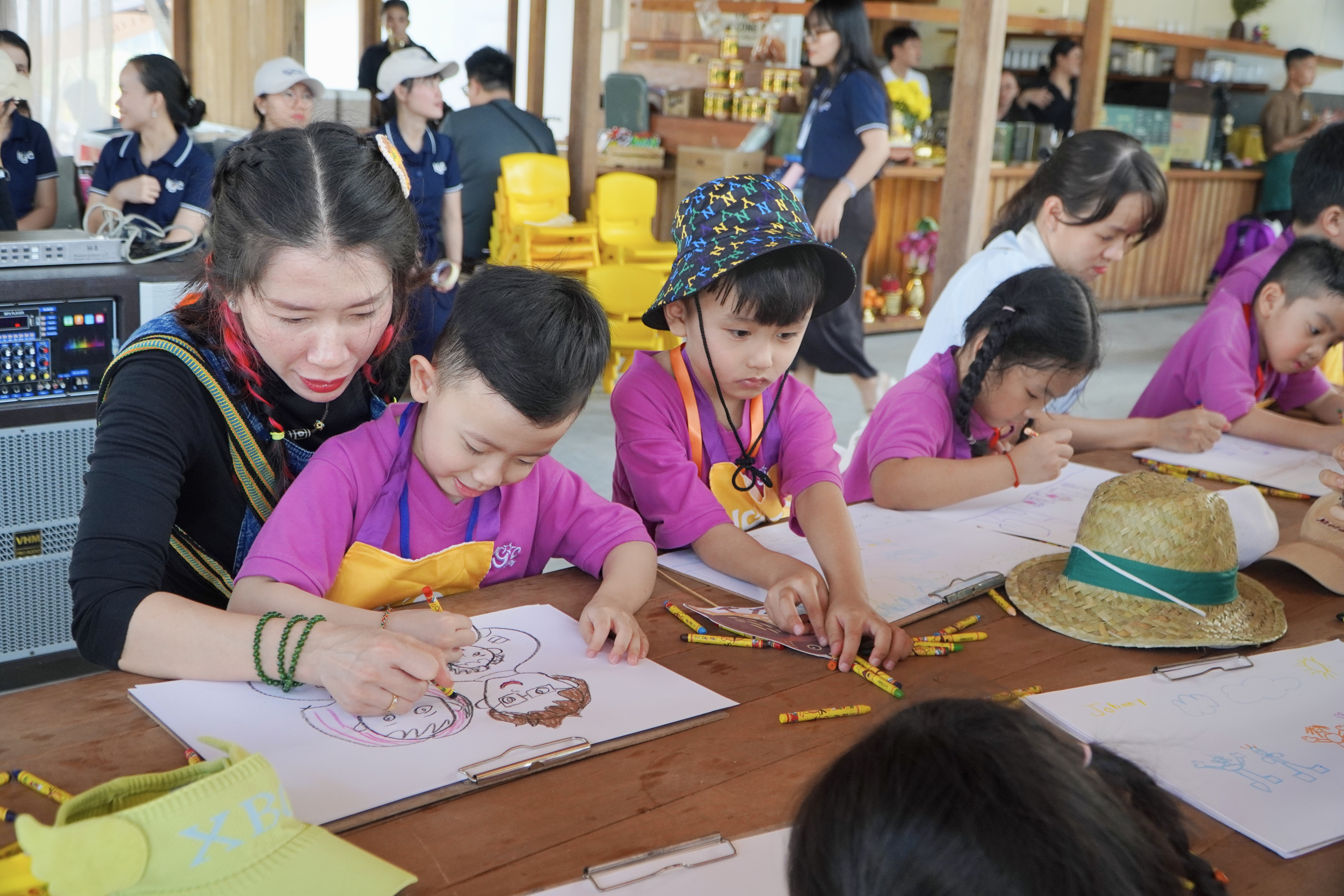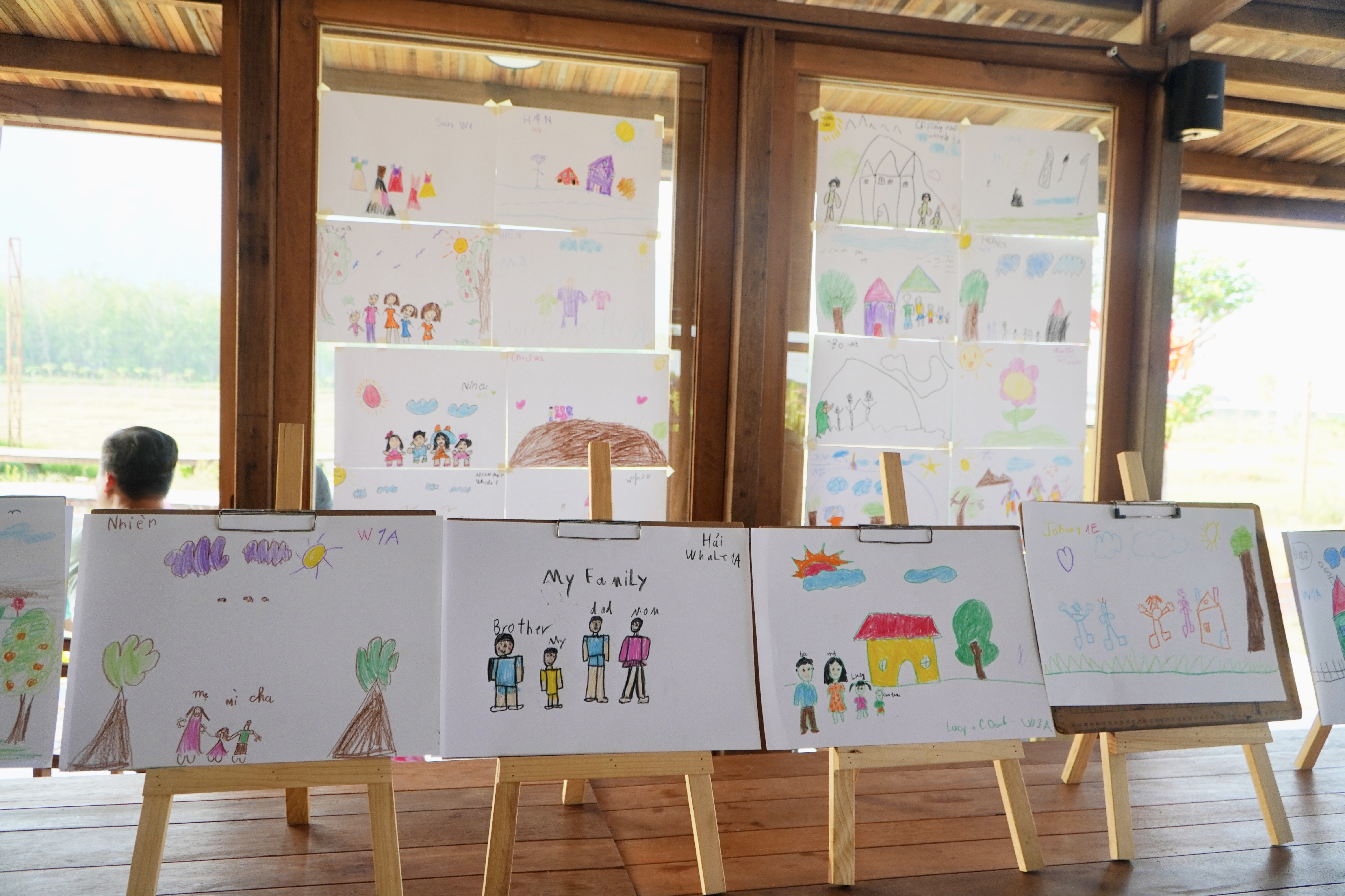 Hoạt động trải nghiệm đa dạng, phát triển toàn diện Trong không gian xanh mát, gần gũi thiên nhiên, các bé đã tham gia nhiều hoạt động ý nghĩa: Vẽ tranh gia đình – gắn kết yêu thương giữa ba mẹ và con Trò chơi vận động: xếp chữ, đoán tên động vật cùng giáo viên nước ngoài Giao lưu, tương tác giúp phát triển kỹ năng ngôn ngữ và sự tự tin Biểu diễn văn nghệ – nơi các con gửi lời yêu thương đến ba mẹ