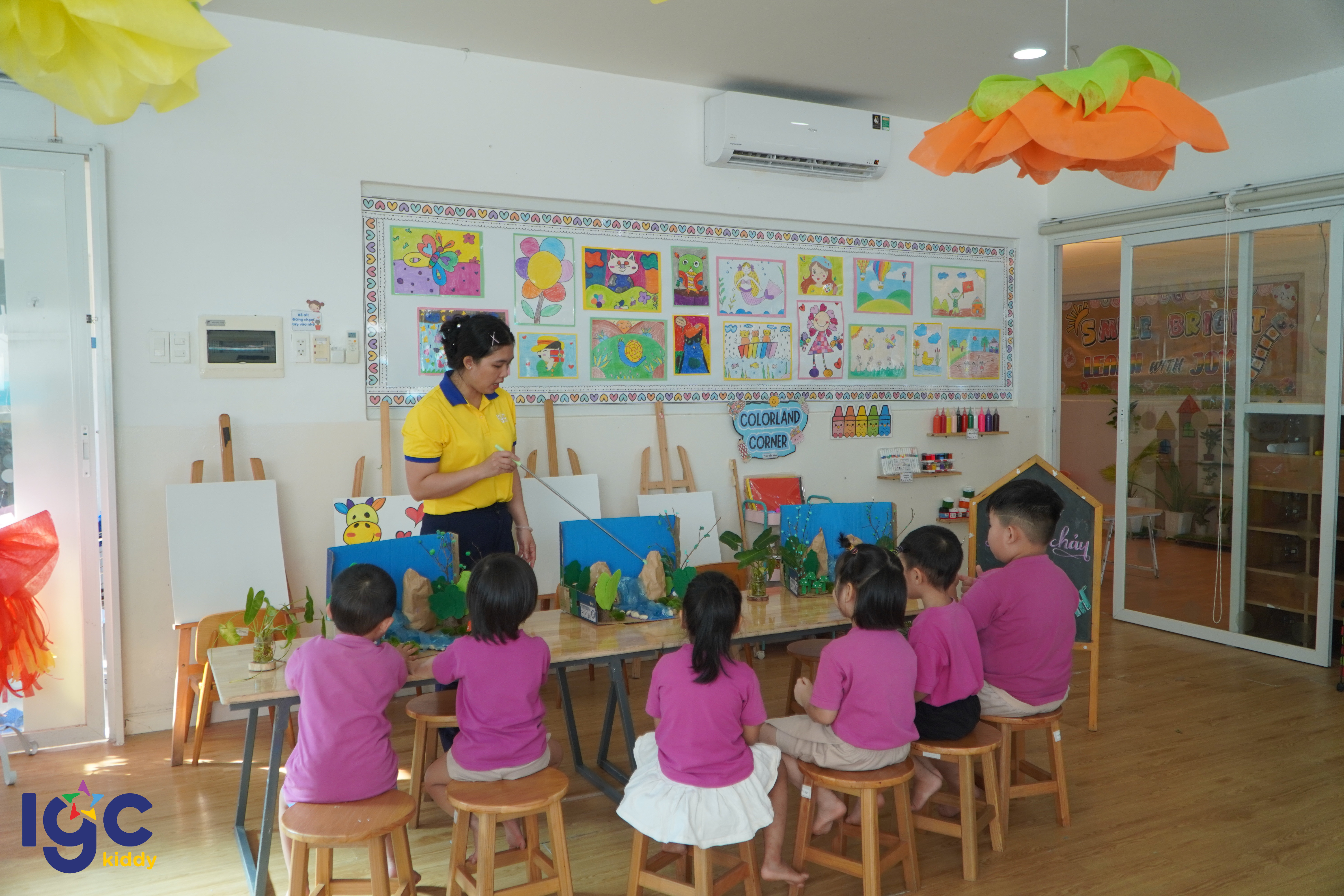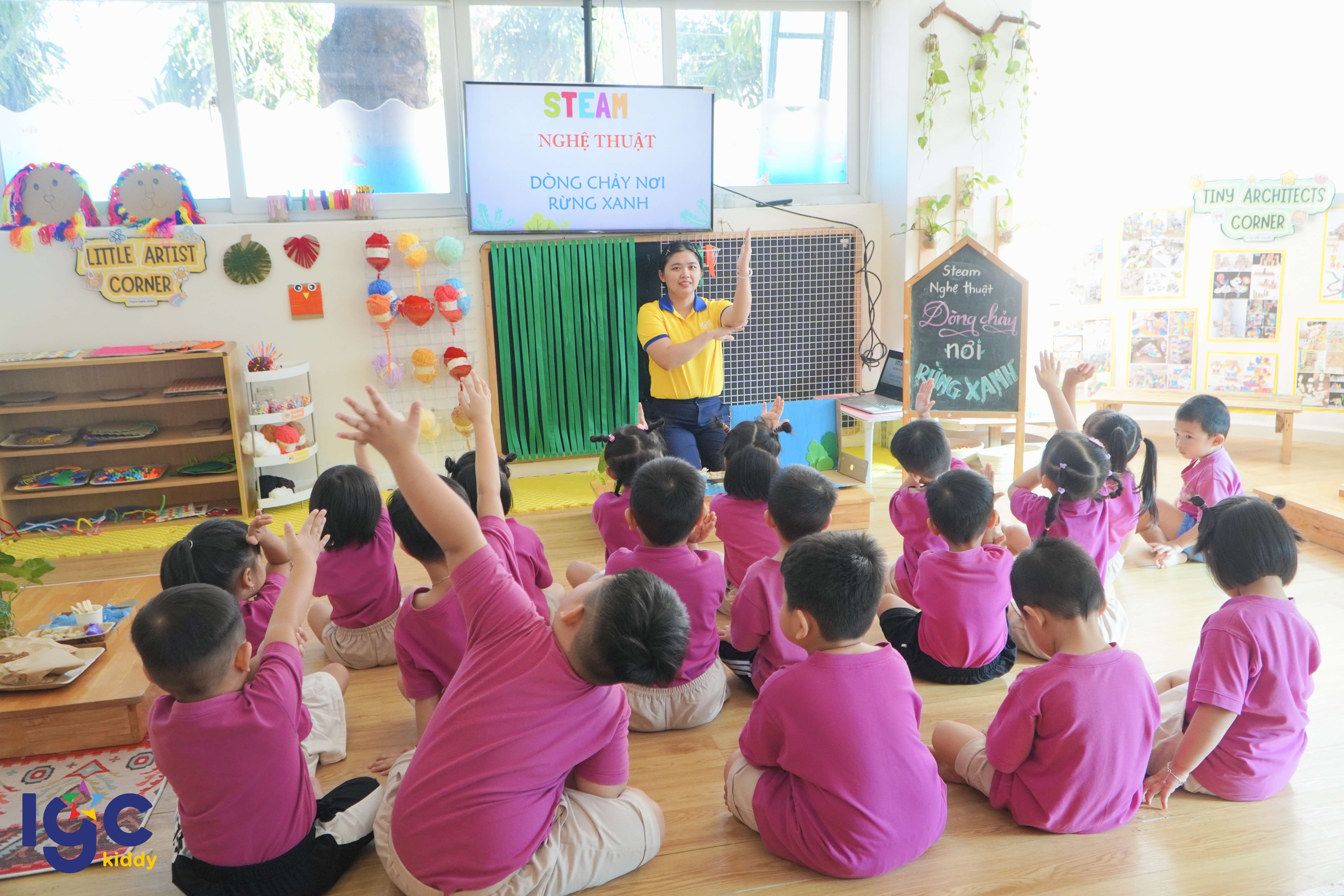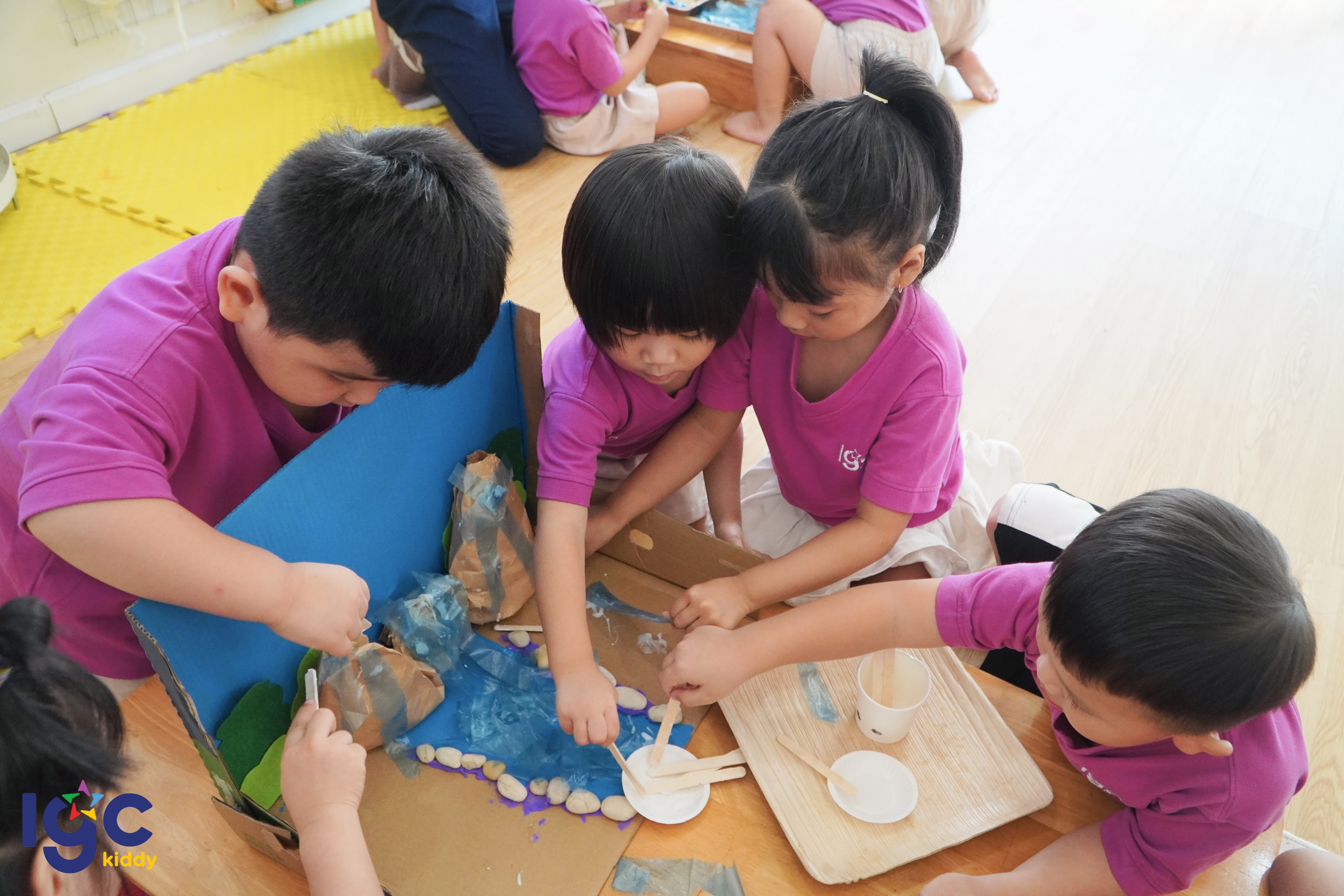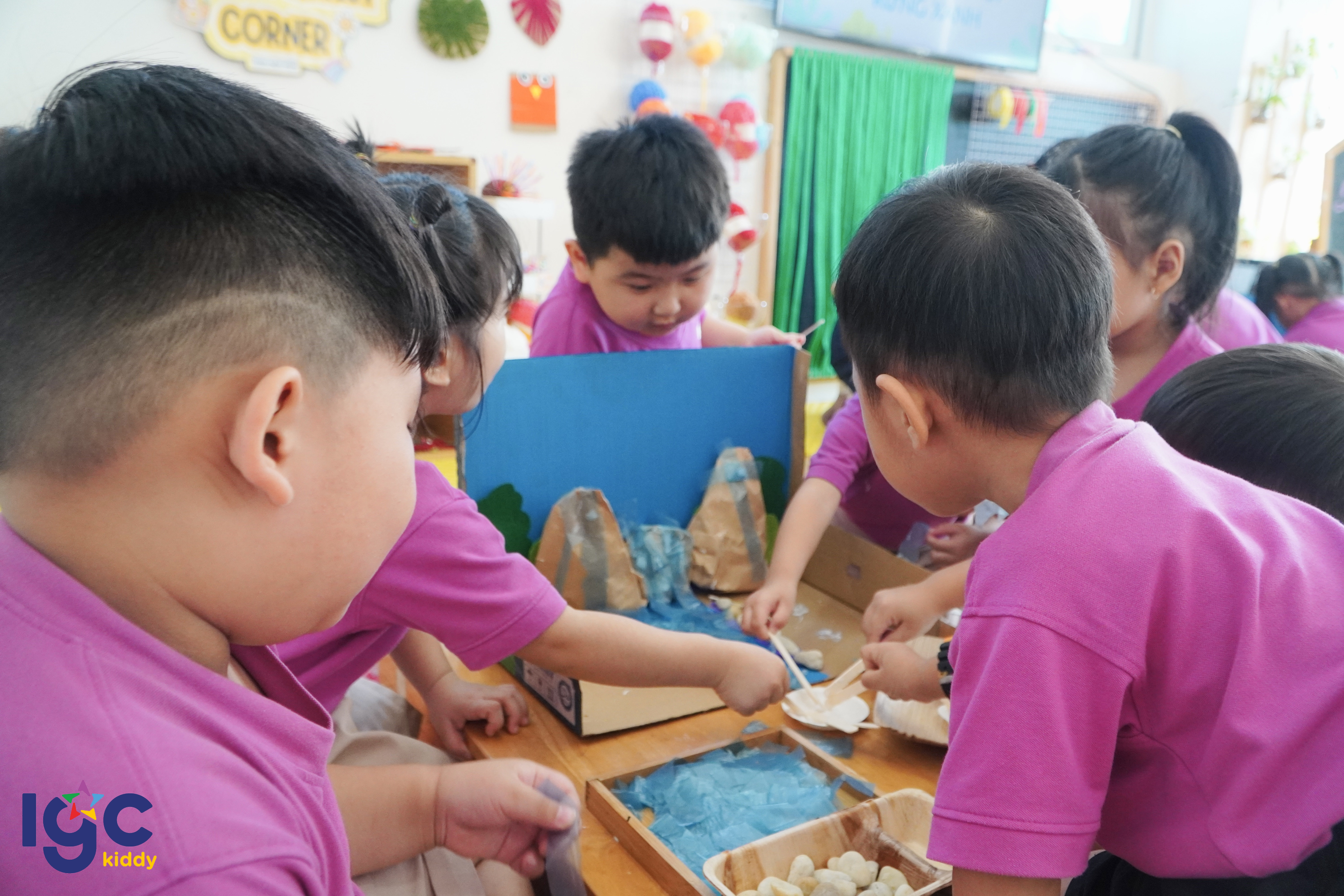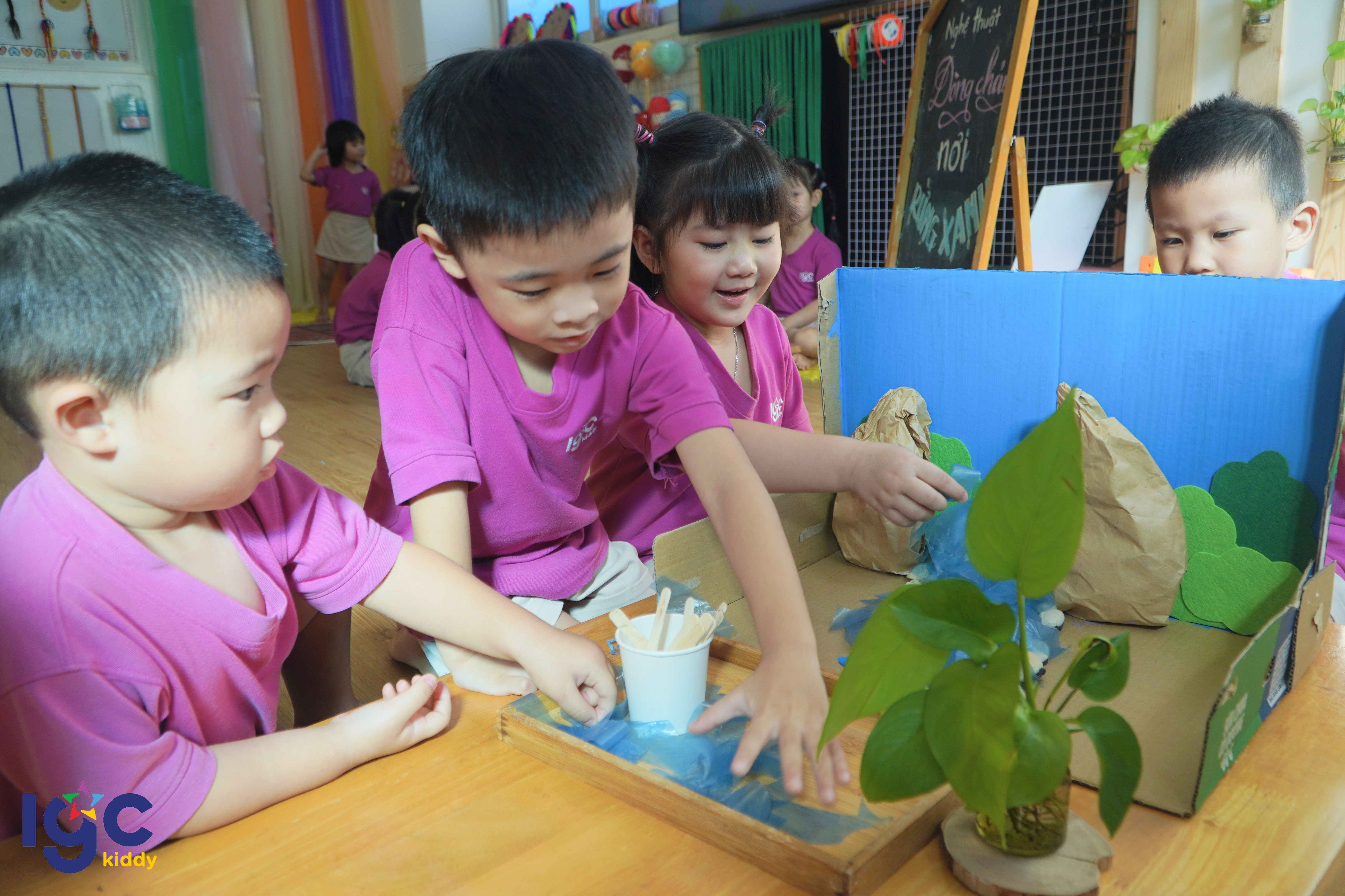 Trong giờ STEAM hôm nay, các bạn nhỏ lớp Dolphin 2A đã có cơ hội bước vào một “khu rừng nhiệt đới thu nhỏ” do chính đôi tay của mình tạo nên. Từ những tán cây xanh mát, dòng suối len lỏi đến các chi tiết nhỏ xinh trong khu rừng… tất cả đều được các bé chăm chút tỉ mỉ và đầy sáng tạo. Khi hoạt động khám phá “dòng chảy trong rừng xanh” bắt đầu, các bạn nhỏ vô cùng háo hức quan sát xem nước chảy như thế nào, dòng suối ảnh hưởng ra sao đến cây cối và các loài động vật trong rừng. Mỗi phát hiện nhỏ đều mang đến sự thích thú và mở ra thêm nhiều câu hỏi mới cho hành trình tìm hiểu của các con. Thông qua những hoạt động trải nghiệm nhẹ nhàng và giàu tính khám phá, IGC Kiddy Tây Ninh mong muốn mang đến cho trẻ sự tự tin, khả năng quan sát và tư duy sáng tạo. Những khoảnh khắc học tập đầy cảm hứng này cũng sẽ là điều khiến ba mẹ thêm tự hào về từng bước trưởng thành của bé mỗi ngày.