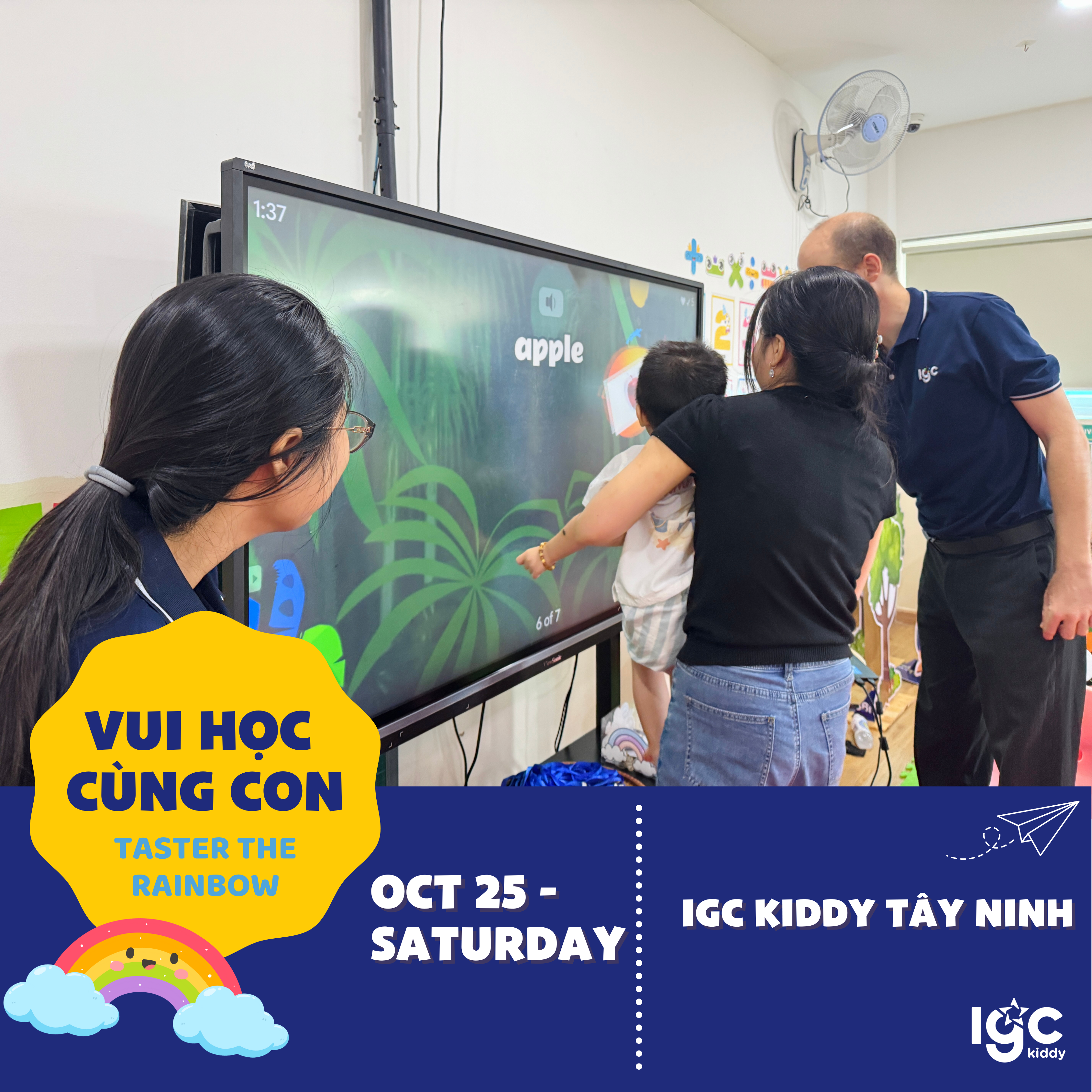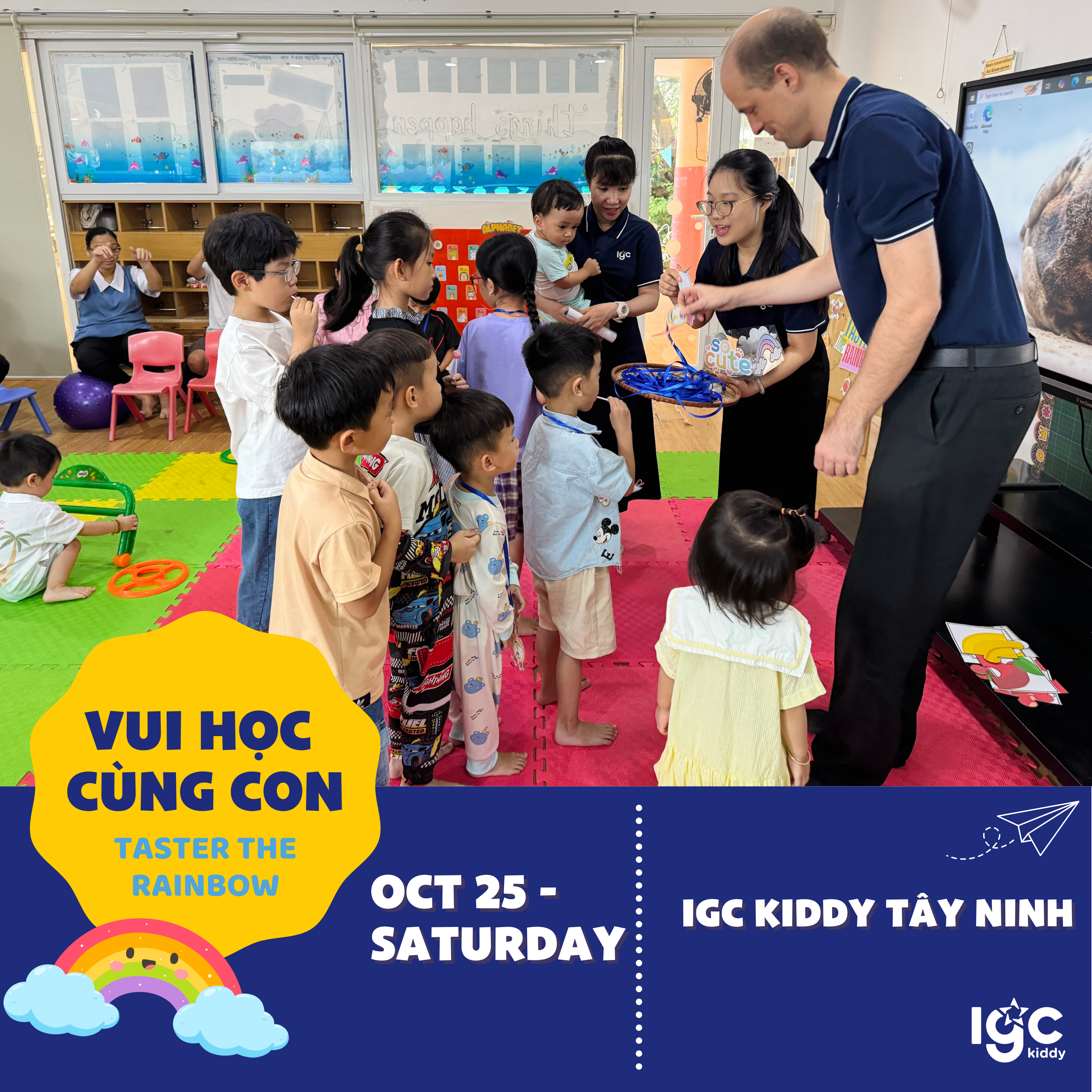 Các con được: Học từ vựng về màu sắc thông qua hoạt động pha trộn và nhận diện màu. Giao tiếp tiếng Anh tự nhiên với giáo viên bản ngữ. Vừa hát, vừa vận động, vừa học – tạo nên không khí vui tươi và đầy hứng khởi. Khoảnh khắc gắn kết cùng ba mẹ Không chỉ là một buổi học, “Vui học cùng con – Taste the Rainbow” còn là khoảng thời gian quý giá để ba mẹ đồng hành cùng con trong lớp học, cùng cười, cùng tham gia và chứng kiến con tự tin thể hiện khả năng Anh ngữ của mình. Những nụ cười rạng rỡ, ánh mắt háo hức và bàn tay nhỏ xíu giơ cao khoe thành quả – tất cả đã tạo nên một ngày đáng nhớ, nơi việc học trở thành niềm vui và cảm hứng khám phá thế giới. Chuỗi hoạt động “Vui học cùng con” tại IGC Kiddy Tây Ninh IGC Kiddy Tây Ninh tổ chức chuỗi chương trình “Vui học cùng con” hoàn toàn miễn phí hằng tháng dành cho trẻ từ 24 tháng đến 5 tuổi. Mỗi buổi trải nghiệm là một chủ đề mới mẻ, sáng tạo, giúp trẻ được học – chơi – trải nghiệm – lớn lên trong yêu thương.