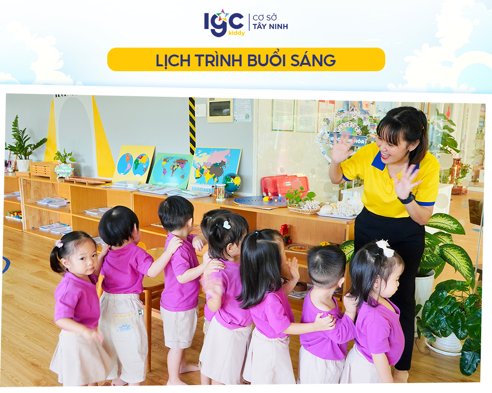 Hoạt động học tập buổi sáng tại Trường Mầm Non IGC Tây Ninh được xây dựng dựa trên Chương trình Giáo dục Mầm non của Bộ Giáo dục & Đào tạo, kết hợp với các phương pháp giáo dục hiện đại như Montessori và học qua trải nghiệm. Trẻ được học thông qua hoạt động thực hành, quan sát và khám phá thay vì ghi nhớ máy móc.